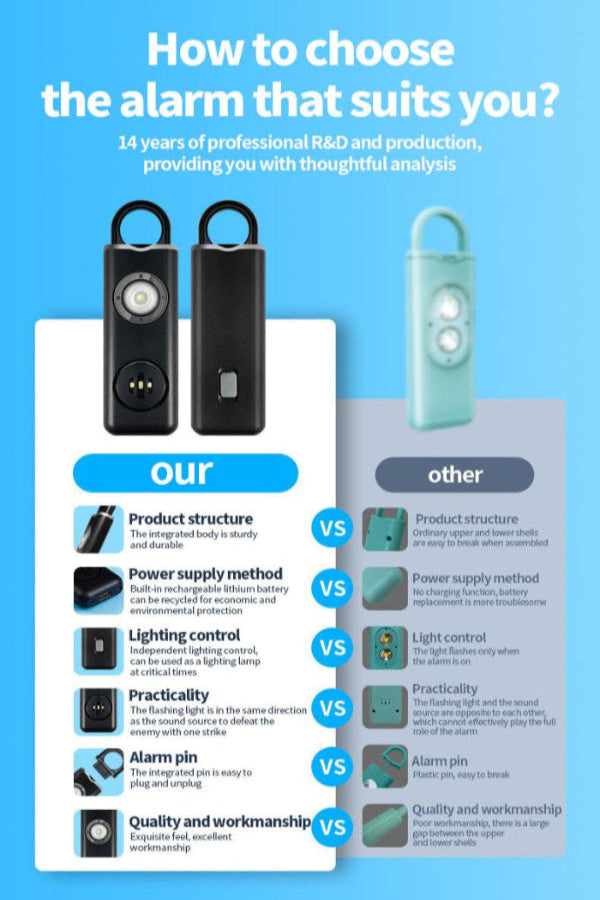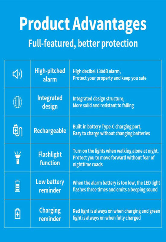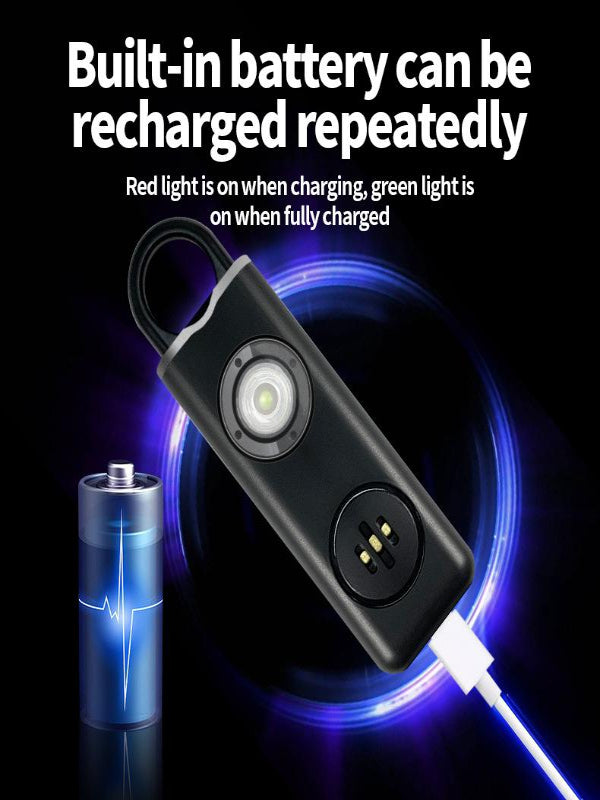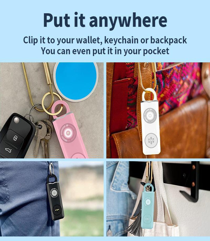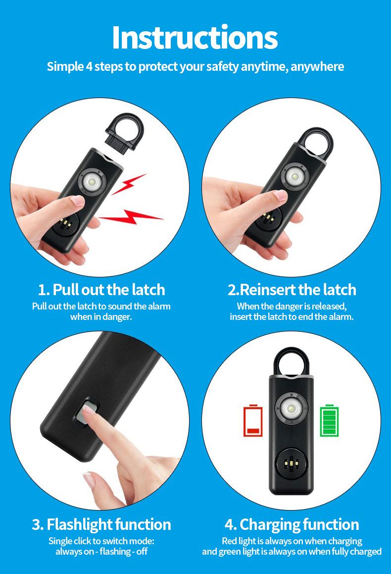 A: It’s super simple—push the button to use the flashlight, or pull the loop to activate the 130dB alarm and strobe light instantly.